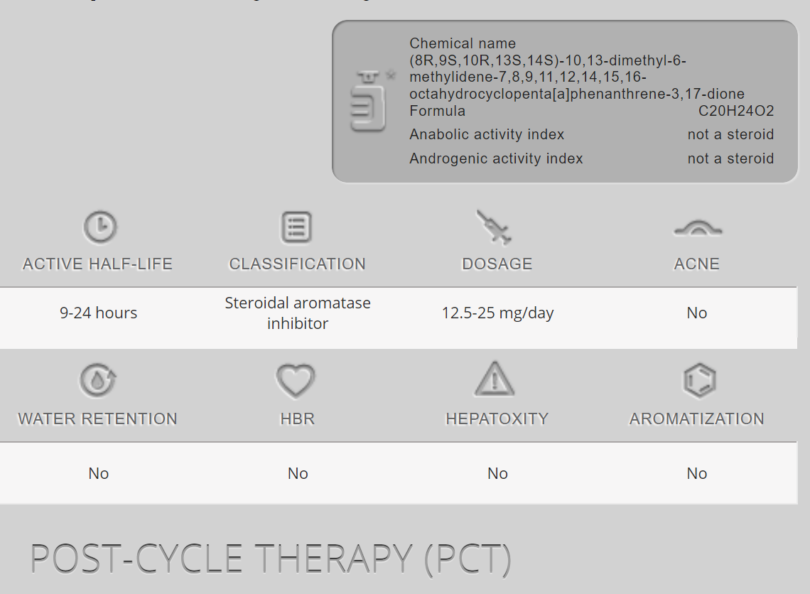 Hơn nữa, exemestane là một loại thuốc hoàn hảo cho liệu pháp sau chu kỳ và phục hồi HPTA. Ví dụ, các nghiên cứu đã chứng minh rằng exemestane với liều 25 mg mỗi ngày đã tăng tổng lượng testosterone lên 60% chỉ trong 10 ngày. Không có chất ức chế aromatase nào khác có thể so sánh về hiệu quả phục hồi HPTA. Tất cả những điều này khiến exemestane trở thành một lựa chọn hoàn hảo cho liệu pháp sau chu kỳ cũng như kiểm soát estrogen trong chu kỳ.