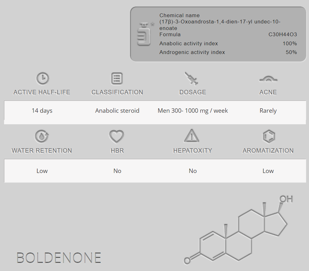 Boldenone là một loại steroid tiêm kéo dài có đặc tính anabolic mạnh mẽ và mức độ androgenic vừa phải. Các đặc tính androgenic thấp giúp cho phụ nữ có thể sử dụng boldenone. Hiện tượng trở nam giới hiếm khi xảy ra so với các loại steroid khác.