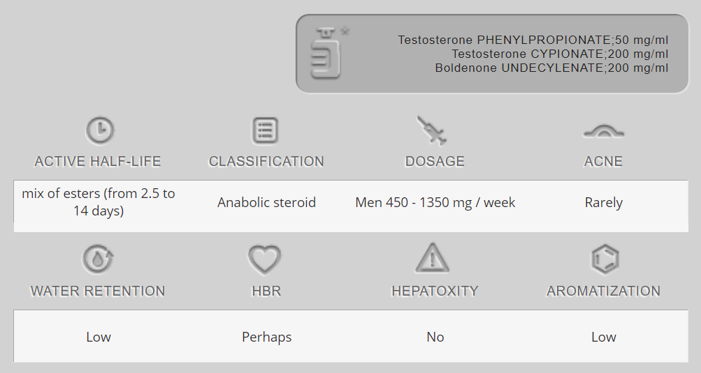 PHARMA MIX 1 là một sự kết hợp tuyệt vời và tiện lợi của ba loại thuốc phù hợp cho việc tăng cơ: testosterone phenylpropionate, testosterone cypionate và boldenone undecylenate. Các vận động viên rất coi trọng testosterone vì khả năng thúc đẩy sự gia tăng mạnh mẽ về khối lượng cơ bắp và sức mạnh. Boldenone được các vận động viên thể hình ưa chuộng vì khả năng thúc đẩy sự phát triển cơ bắp lean, dày và chất lượng cao mà không gây giữ nước, cũng như tác dụng đáng kể trong việc tăng cường tính mạch và sự thèm ăn. Với sự cân bằng hợp lý giữa độ mạnh và tác dụng phụ, PHARMA MIX 1 phù hợp cho cả người mới bắt đầu và các chuyên gia.