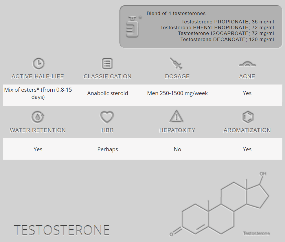 Trong việc sử dụng cho thể hình, testosterone hầu như luôn được sử dụng dưới dạng ester hoặc huyền phù tiêm do khả năng sinh học qua đường uống kém và sự không thực tế của việc sử dụng liều cao qua đường thẩm thấu qua da hoặc dưới lưỡi. Tất cả các dạng testosterone, trong một phạm vi rộng, đều giống nhau: hoạt chất testosterone + ester gắn vào, điều này quyết định thời gian giải phóng và thời gian tồn tại của hợp chất hoạt tính. Nói ngắn gọn: các ester dài giải phóng hoạt chất vào máu chậm, nhưng cung cấp mức hormone ổn định trong thời gian dài (tùy thuộc vào ester), mà không tạo ra các đỉnh.