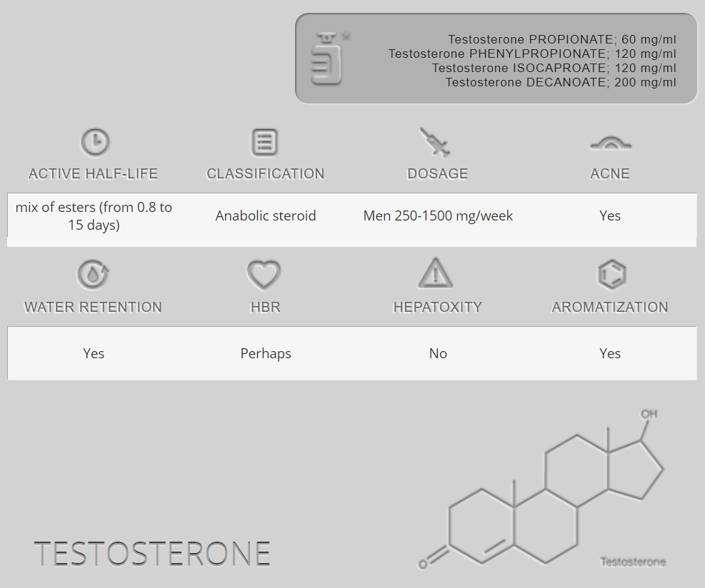 Testosteron được ưa chuộng cao bởi các vận động viên vì khả năng tăng cường mạnh mẽ cả về cơ bắp và sức mạnh. Là một hormone tự nhiên, nó vẫn là steroid tăng cơ phổ biến nhất và thường được sử dụng làm cơ sở cho tất cả các chu kỳ và tổ hợp.