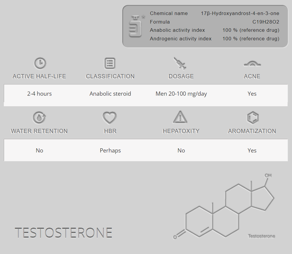 Testosteron được ưa chuộng cao bởi các vận động viên vì khả năng tăng cường mạnh mẽ cả về cơ bắp và sức mạnh. Là một hormone tự nhiên, nó vẫn là steroid tăng cơ phổ biến nhất và thường được sử dụng làm cơ sở cho tất cả các chu kỳ và tổ hợp.