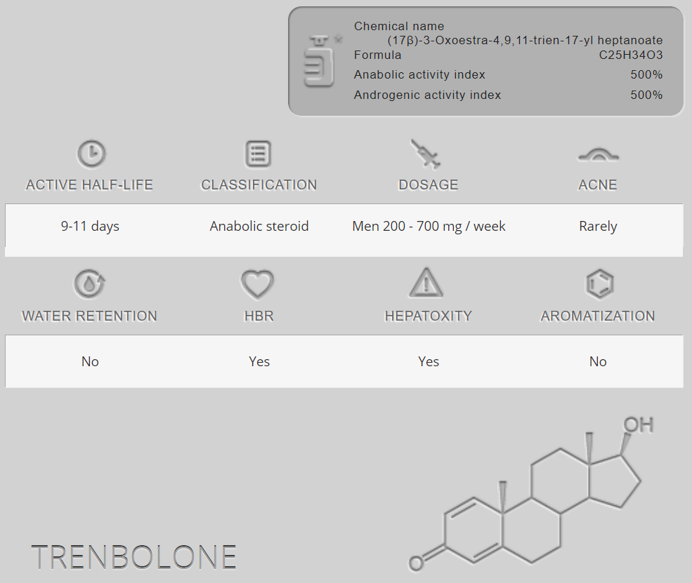 Tuy nhiên, những tác dụng xây dựng khối lượng cơ tuyệt vời của nó chưa dừng lại ở đó. Steroid này liên kết trực tiếp với các thụ thể androgen mạnh hơn nhiều so với testosterone và do đó trực tiếp kích thích quá trình đốt cháy mỡ. Bên cạnh một loạt lợi ích như vậy, trenbolone cũng có tác dụng phụ. Trenbolone là một biến đổi 19-nor của testosterone, điều này làm cho nó có tính chất progestogenic tương tự như nandrolone, do đó, các chất ức chế prolactin (cabergoline) nên được sử dụng nếu cần.