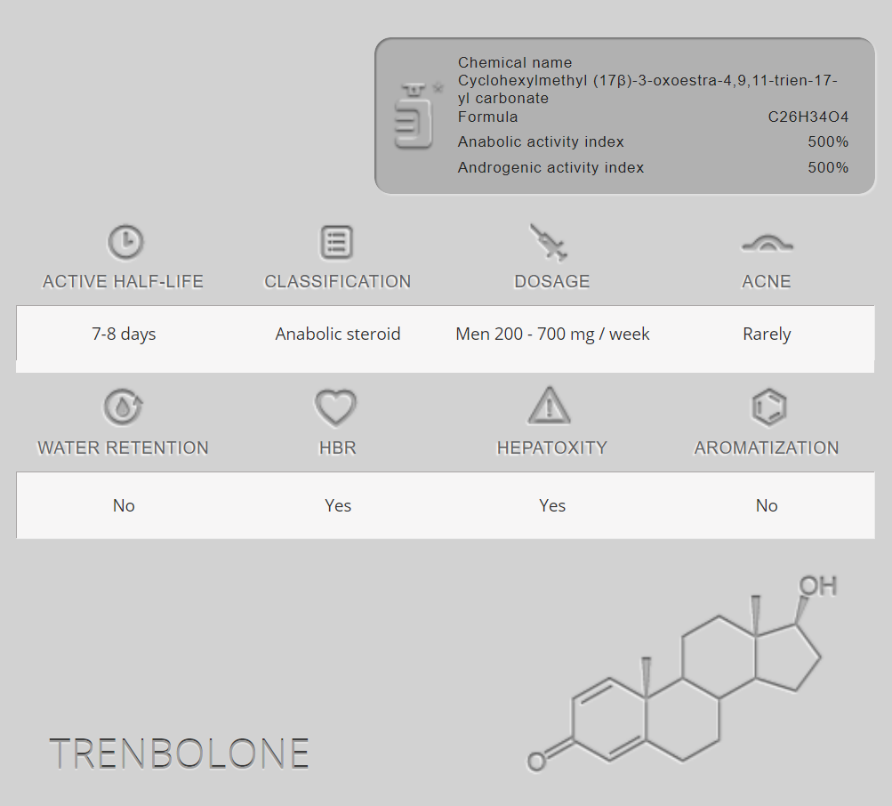 Tuy nhiên, hiệu quả xây dựng cơ bắp đáng kinh ngạc của nó không chỉ dừng lại ở đó. Steroid này chặt chẽ hơn nhiều so với testosterone, trực tiếp kết hợp với receptor androgen và do đó trực tiếp kích thích đốt cháy chất béo. Cùng với một loạt các lợi ích như vậy, trenbolone cũng có tác dụng phụ. Trenbolone là loại biến đổi 19-nor của testosterone, khiến cho nó có tính progestogenic tương tự như nandrolone, do đó, các chất ức chế prolactin (cabergoline) nên được sử dụng, nếu cần.