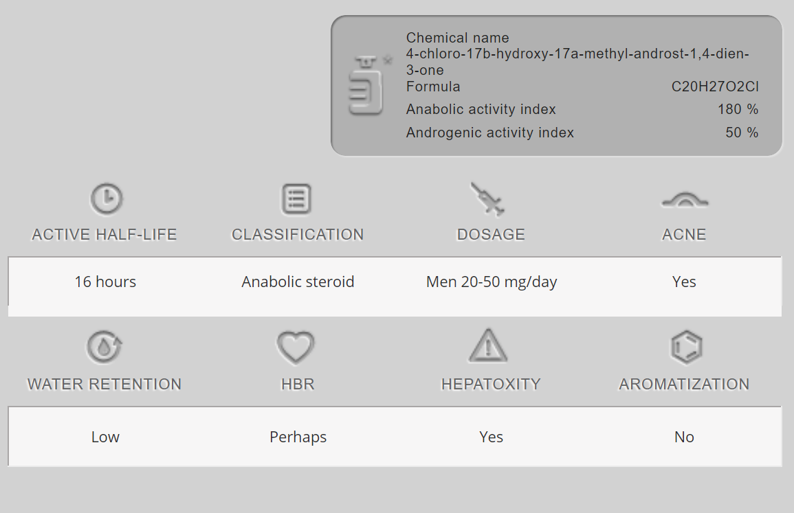 Chlorodehydromethyltestosterone (còn được biết đến với tên gọi Turinabol) được công ty dược phẩm Đông Đức Jenapharm tạo ra để các vận động viên Olympic và cấp quốc gia sử dụng. Nó đã được cấp bằng sáng chế vào năm 1961. Turinabol dạng uống trở thành một loại steroid nổi tiếng trong thập niên 1990, khi người ta tiết lộ rằng chlorodehydromethyltestosterone là một trong những bí mật được giữ kín trong “Cỗ máy Doping Đông Đức.” Do sự thay đổi cấu trúc so với Dianabol, Turinabol không xảy ra quá trình aromatization và có tính chất androgen thấp. Giống như bất kỳ steroid dạng uống alkyl hóa nào, Turinabol ảnh hưởng xấu đến mức cholesterol trong máu (mặc dù không nghiêm trọng như stanozolol). Nó cũng làm giảm globulin gắn kết hormone sinh dục (SHBG) và, kết quả là, tăng mức testosterone tự do hoạt động sinh học trong máu. Điều này giải thích hiệu ứng cộng hưởng mạnh mẽ khi sử dụng Turinabol trong stack với các loại steroid khác, chẳng hạn như testosterone. Mặc dù thực tế là Turinabol đôi khi được coi là một loại thuốc tương đối yếu, nó ức chế trục hạ đồi – tuyến yên – tinh hoàn (HPTA) và làm giảm sản xuất testosterone nội sinh. Do đó, liệu pháp sau chu kỳ (PCT) dựa trên các chất chống estrogen là cần thiết để phục hồi nhanh nhất hệ thống nội tiết và giữ lại kết quả đã đạt được trong chu kỳ. Nói chung, Turinabol có thể được mô tả như một dẫn xuất nhẹ hơn của methandienone mà không xảy ra quá trình aromatization hay giữ nước.