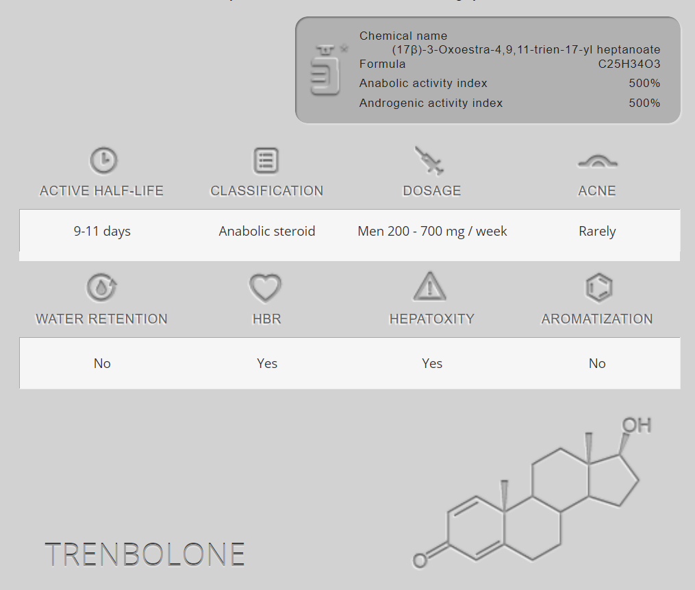 Tuy nhiên, hiệu ứng xây dựng khối lượng đáng kinh ngạc của nó không dừng lại ở đó. Steroid này gắn kết mạnh mẽ, mạnh hơn testosterone, trực tiếp vào các thụ thể androgen và do đó kích thích trực tiếp quá trình đốt cháy mỡ. Cùng với một lượng lợi ích như vậy, trenbolone cũng có tác dụng phụ. Trenbolone là một biến thể 19-nor của testosterone, khiến nó có tính progestogenic tương tự như nandrolone, do đó, cần sử dụng các chất ức chế prolactin (cabergoline) nếu cần.